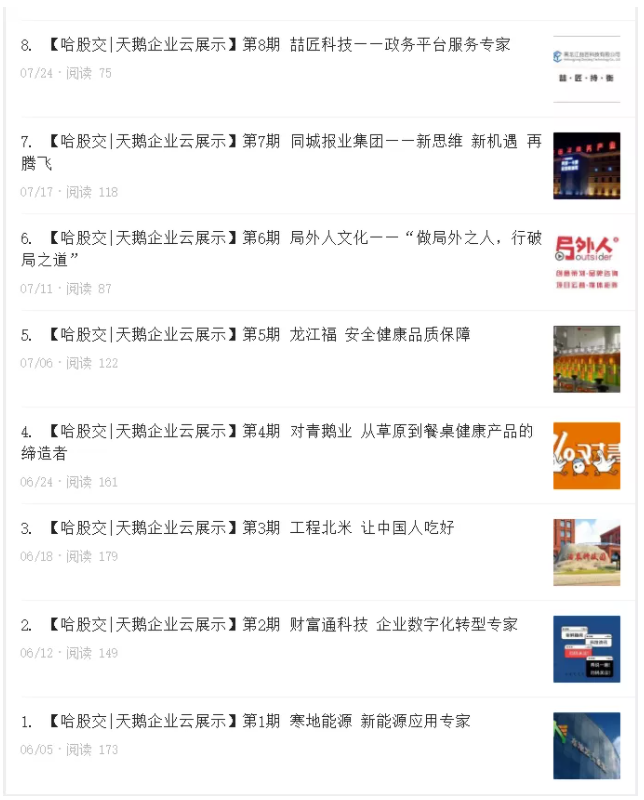 2020年,哈股交以“展示龍江企業(yè)風(fēng)采,對接資本市場服務(wù)”為行動宗旨,在疫情期間推出“天鵝企業(yè)云展示”公益服務(wù),助力企業(yè)復(fù)工復(fù)產(chǎn)。