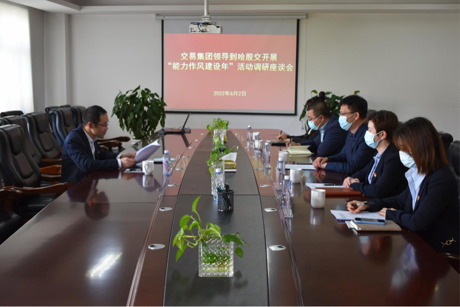 新聞中心 > 子公司動態(tài)按照交易集團黨委關(guān)于領(lǐng)導(dǎo)班子成員深入基層黨建聯(lián)系點宣講省第十三次黨代會精神,深入“能力作風(fēng)建設(shè)年”活動包聯(lián)企業(yè)調(diào)研指導(dǎo)“能力作風(fēng)建設(shè)年”活動的工作部署,6月2日,交易集團黨委委員、董秘徐松之到哈爾濱股權(quán)交易中心(以下簡稱哈股交)組織召開調(diào)研座談會,現(xiàn)場宣講省第十三次黨代會精神,就哈股交開展“能力作風(fēng)建設(shè)年”活動和支部黨建等工作情況聽取工作匯報,與哈股交中層以上管理人員進行座談交流。