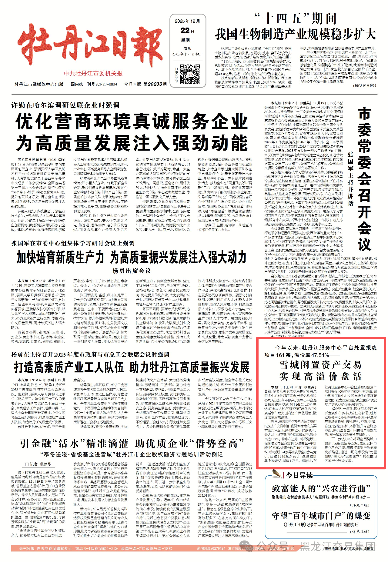 據(jù)介紹,一年來,圍繞服務(wù)龍江振興發(fā)展和市委市政府任務(wù)部署,牡丹江服務(wù)中心積極搭建服務(wù)循環(huán)經(jīng)濟發(fā)展市場化橋梁,通過服務(wù)、資源、數(shù)智、合規(guī)“四輪驅(qū)動”,不斷提升專業(yè)服務(wù)能級,助力國資國企閑置資產(chǎn)高效盤活,充分釋放高質(zhì)量發(fā)展新活力。