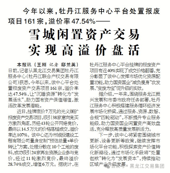 日前,記者從黑龍江交易集團牡丹江服務(wù)中心(牡丹江聯(lián)合產(chǎn)權(quán)交易有限公司)獲悉,今年以來,該中心平臺處置報廢資產(chǎn)交易項目161宗,溢價率達47.54%,讓“沉睡資源”轉(zhuǎn)化為“發(fā)展活水”,助力國有資產(chǎn)保值增值,激活改革發(fā)展?jié)撃堋?